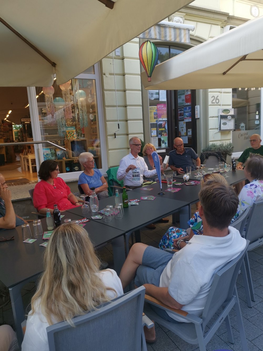 Bei einer gut besuchten Veranstaltung vor der örtlichen Buchhandlung in Burscheid präsentierte Dr. Jörg Wagner, Landratskandidat von BÜNDNIS 90/DIE GRÜNEN, am vergangenen Montag seine Vorstelllungen für den Rheinisch-Bergischen Kreis. Die Veranstaltung in der Buchhandlung bildete den Auftakt einer Reihe politischer Gespräche in Burscheid zur Kommunalpolitik im Vorfeld der anstehenden Kommunalwahl.