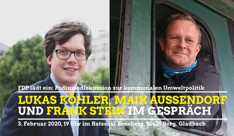 Die FDP Bergisch Gladbach lädt ein zur Podiumsdiskussion über die kommunale Umweltpolitik mit Dr. Lukas Köhler (umweltpolitischer Sprecher der FDP-Bundestagsfraktion), Maik Außendorf (verkehrspolitischer Sprecher der Stadtratsfraktion und Sprecher des Kreisverbands der GRÜNEN) und dem gemeinsamen Bergisch Gladbacher Bürgermeisterkandidaten Frank Stein