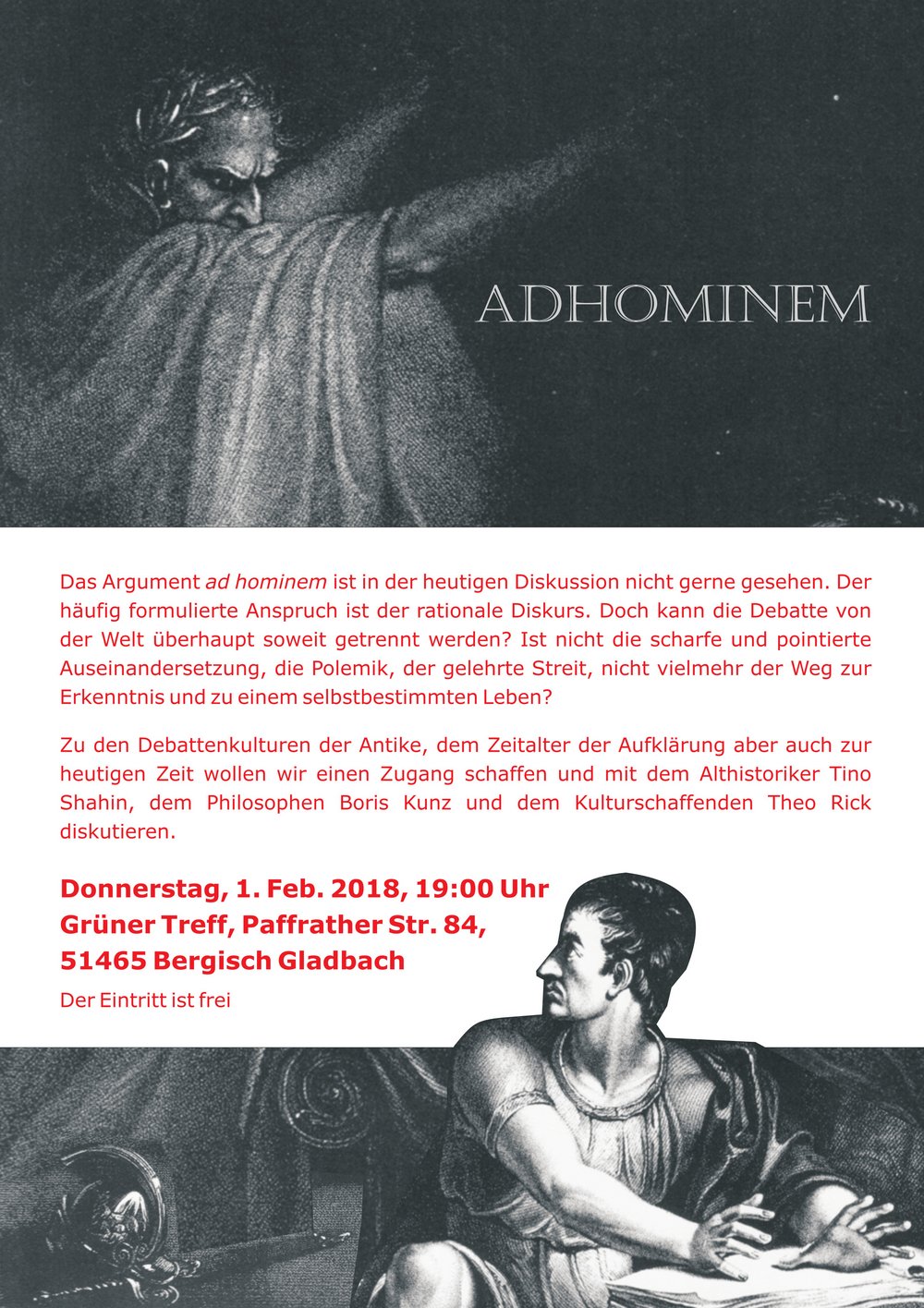 Das Argument ad hominem ist in der heutigen Diskussion nicht gerne gesehen. Der häufig formulierte Anspruch ist der rationale Diskurs. Doch kann die Debatte von der Welt überhaupt soweit getrennt werden? Ist nicht die scharfe und pointierte Auseinandersetzung, die Polemik, der gelehrte Streit, nicht vielmehr der Weg zur Erkenntnis und zu einem selbstbestimmten Leben? Zu den Debattenkulturen der Antike, dem Zeitalter der Aufklärung aber auch zur heutigen Zeit wollen wir einen Zugang schaffen und mit dem Althistoriker Tino Shahin, dem Philosophen Boris Kunz und dem Kulturschaffenden Theo Rick diskutieren.