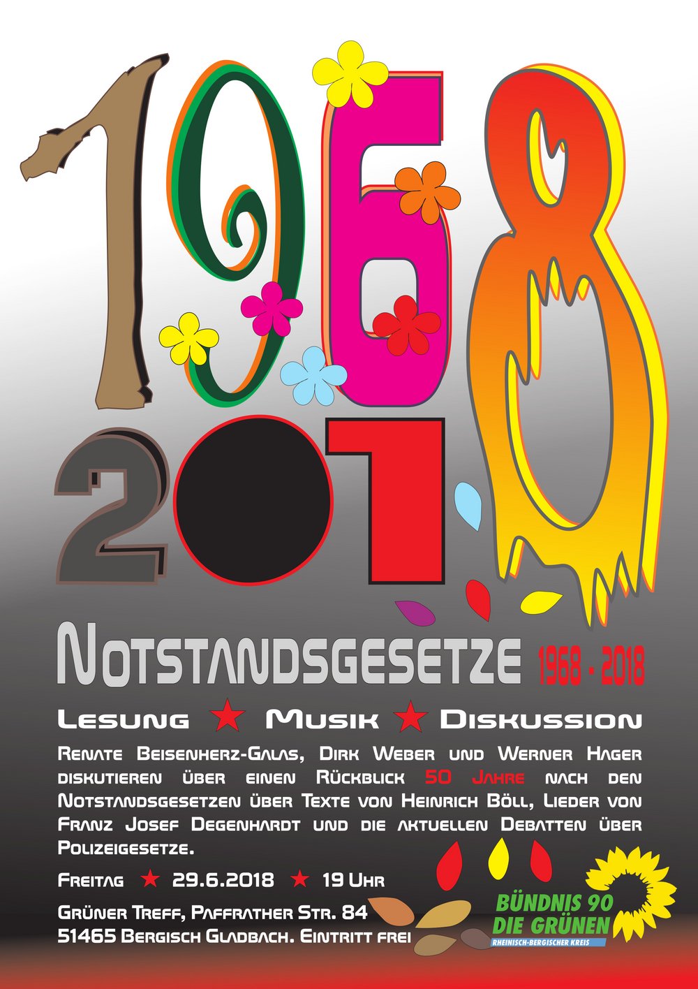 Lesung, Musik und Diskussion. Renate Beisenherz-Galas, Dirk Weber und Werner Hager diskutieren über einen Rückblick 50 Jahre nach den Notstandsgesetzen über Texte von Heinrich Böll, Lieder von Franz Josef Degenhardt und die aktuellen Debatten über Polizeigesetze.