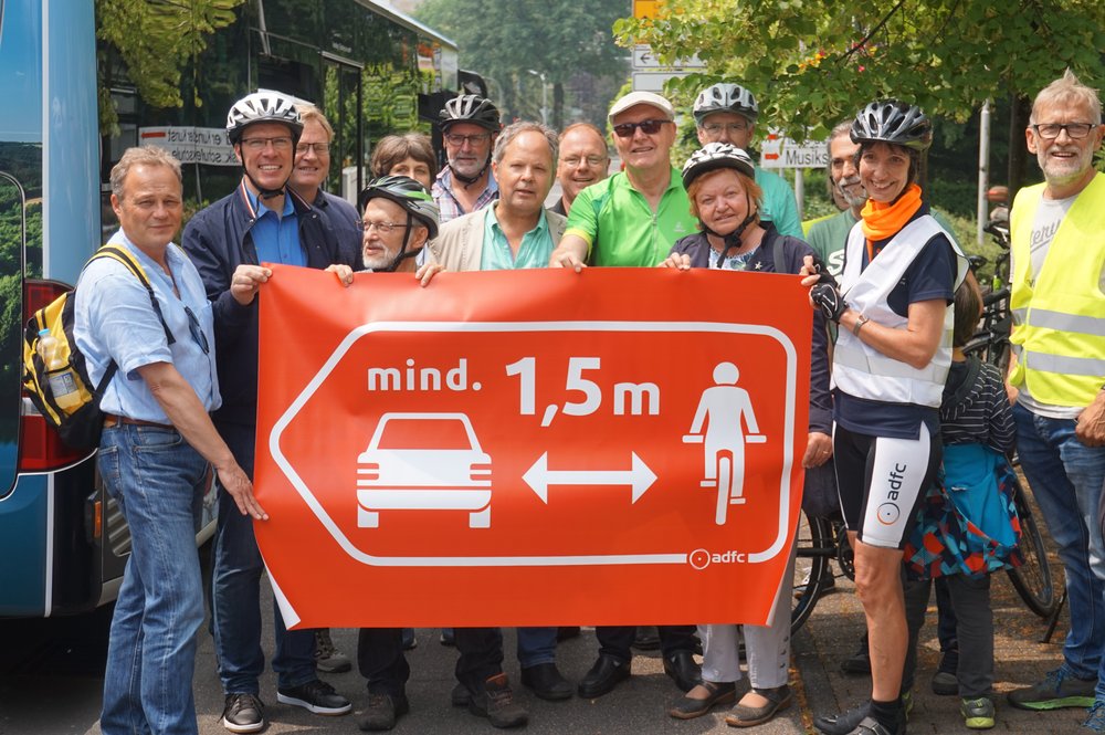 Wie schon in Köln, Aachen und Bonn wirbt der ADFC nun auch im Rheinisch-Bergischen Kreis für mehr Rücksicht beim Überholen von Radfahrer*innen. Mit der Aktion wird auf die geltende Abstandsregelung aufmerksam gemacht. Fußgänger*innen und Radfahrer*innen dürfen nur mit einem Abstand von mindestens 1,5 Metern (bei Kindern sogar 2 Metern) überholt werden - dies gilt auch, wenn Radfahrer*innen auf Radfahr- oder Schutzstreifen unterwegs sind. Viele Autofahrer*innen halten sich an die Regelung. Noch immer aber fahren zahlreiche andere Kraftfahrzeugführer*innen und vor allem LKWs mit zu geringem seitlichen Sicherheitsabstand an den Radfahrer*innen vorbei.